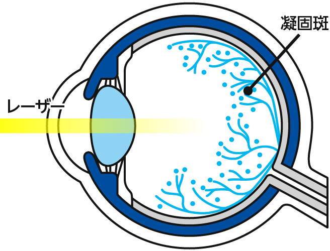 網膜をはじめとする眼底(眼球の奥)の病変部に特定の波長のレーザー光を照射し凝固させることによって病気の進行を抑える治療です。視力が回復するわけではありませんが、網膜に発生する様々な病気の悪化を予防するという点で非常に有効とされています。