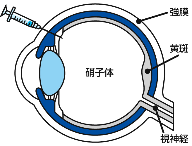 糖尿病網膜症では、長期間の高血糖によって網膜の血管が傷み、血液成分が漏れたり、網膜にむくみ(黄斑浮腫)が生じたりします。硝子体注射は、目の中(硝子体)に薬を直接注入して、網膜のむくみや異常血管の活動を抑える治療法です。
