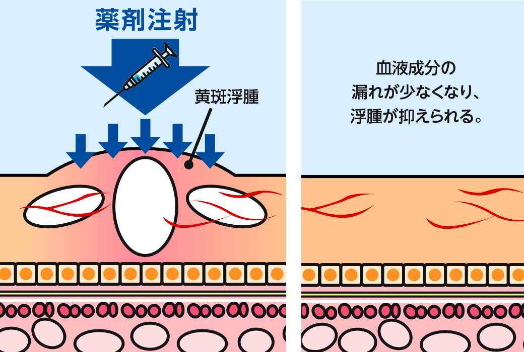 新生血管の成長を促す物質であるVEGF(血管内皮増殖因子)の働きを抑える薬剤を眼内に注射し、異常な新生血管による漏れやむくみを改善することで病気の進行を抑える治療法です。
